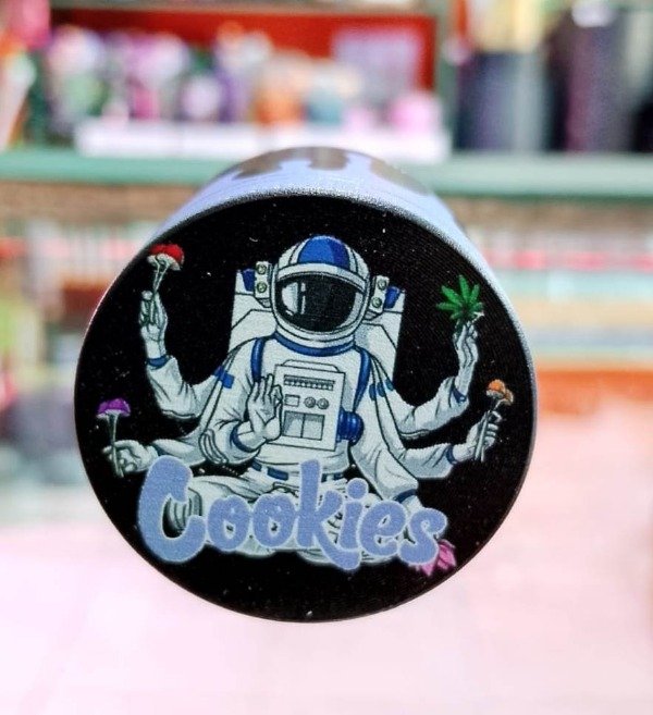 Picador metálico de cuatro partes con diseño Cookies Monsters. Incluye tamiz y compartimento recolector, resistente y eficiente para un molido parejo con estilo divertido y llamativo.